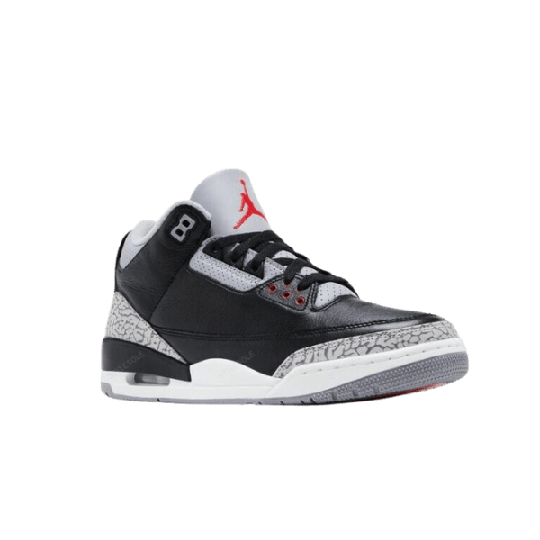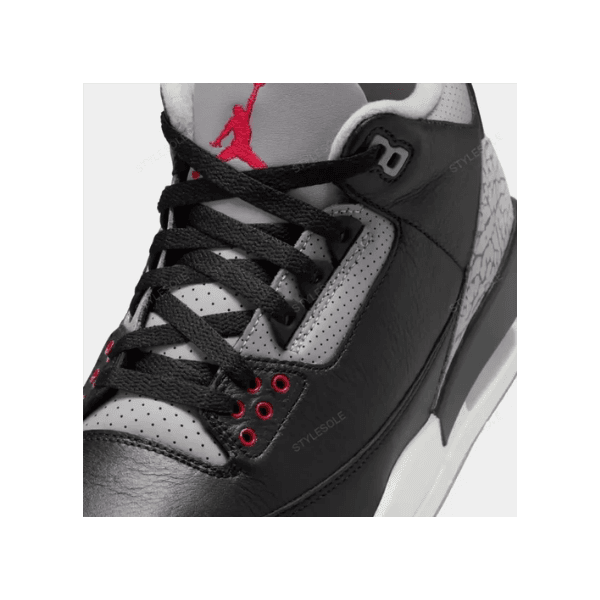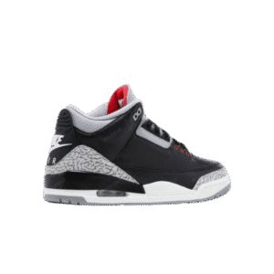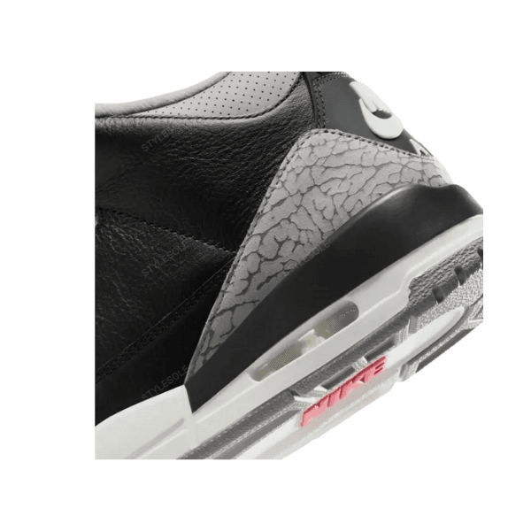 The 2024 version of the Air Jordan 3 Retro OG ‘Black Cement’ stays true to the 1988 original, rolling out a black tumbled leather upper with grey elephant print forefoot and heel overlays. An embroidered red Jumpman stars on the tongue, while a raised Nike Air logo adorns the heel. A white foam midsole equips Air-sole cushioning, adding a touch of black along the heel, anchored by a grey rubber outsole.