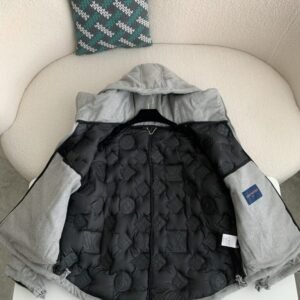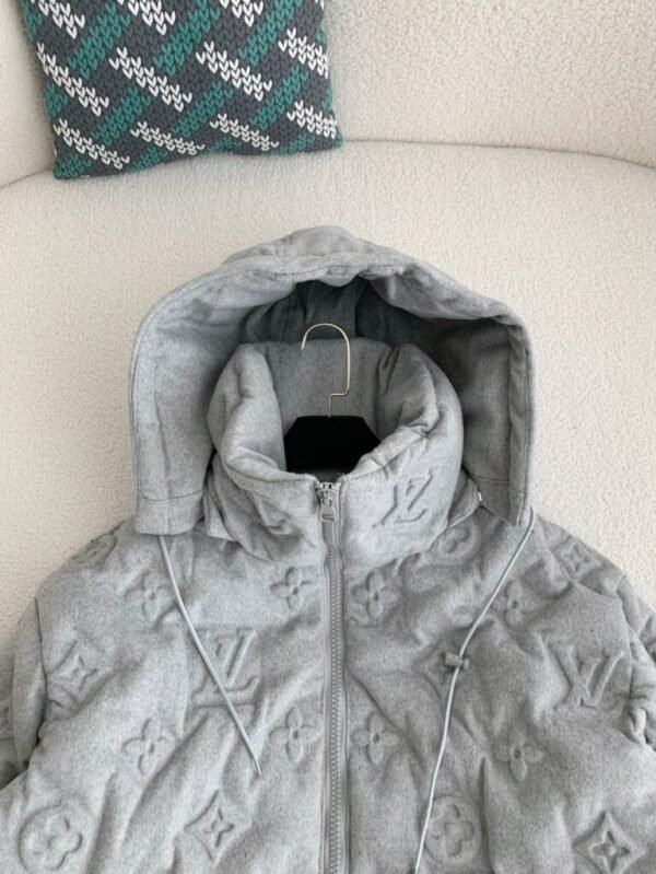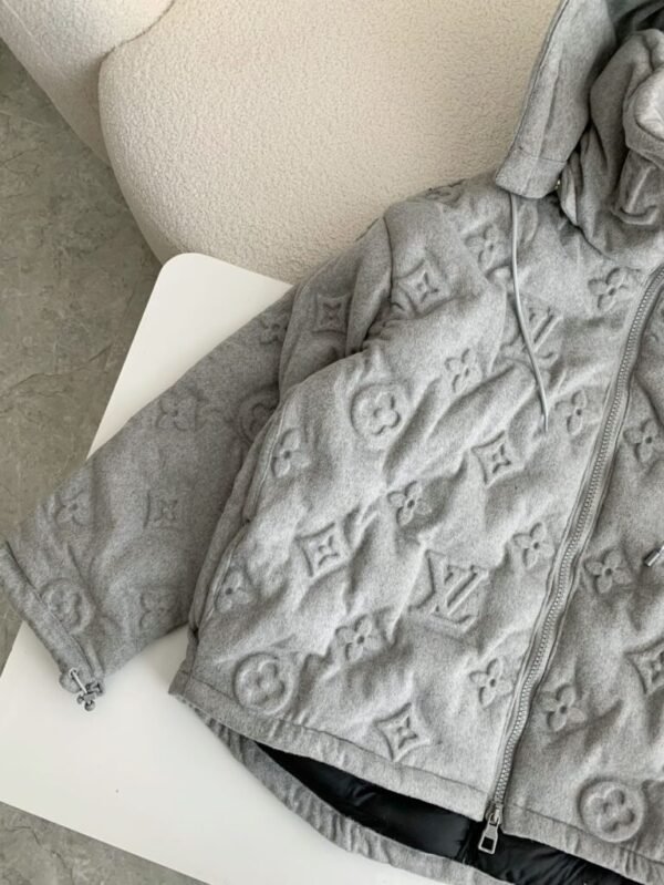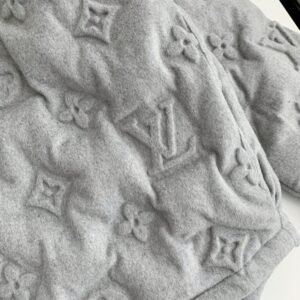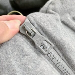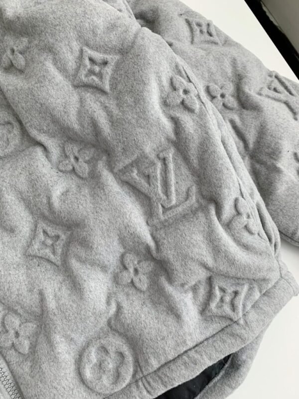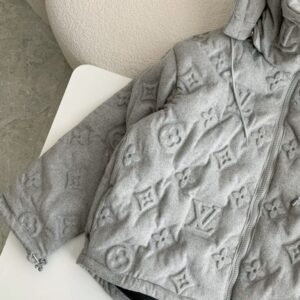 This light grey hoodie jacket stands out with the iconic Louis Vuitton Monogram embossed design across the entire surface. Crafted in a relaxed, modern fit, it features a practical hood with adjustable drawstrings and a premium two-way zipper. The slightly elongated back hem adds both comfort and style, while the black inner lining ensures warmth and coziness, making it perfect for fall and winter.