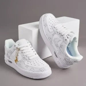 The iconic Nike Air Force 1 gets a couture makeover in this ultra-clean Louis Vuitton custom. Drenched in crisp white from sole to tongue, the shoe features subtle silver-grey LV monogram overlays on premium canvas, bringing quiet texture and refined flair.